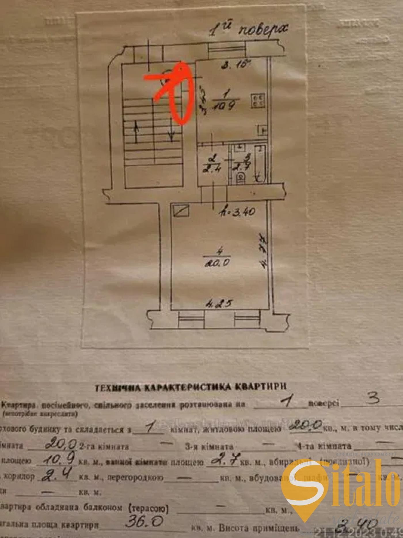 Загальна площа квартири 36 м², житлова 20 м², площа кухні 11 м². Квартира двостороння, велика кімната має 2 фасадних вікна, а вікно кухні виходить на внутрішнє подвір'я з фруктовими деревами. Також до квартири належить великий підвал. Стан середній, опалення пічне, газове. Квартира не кутова.