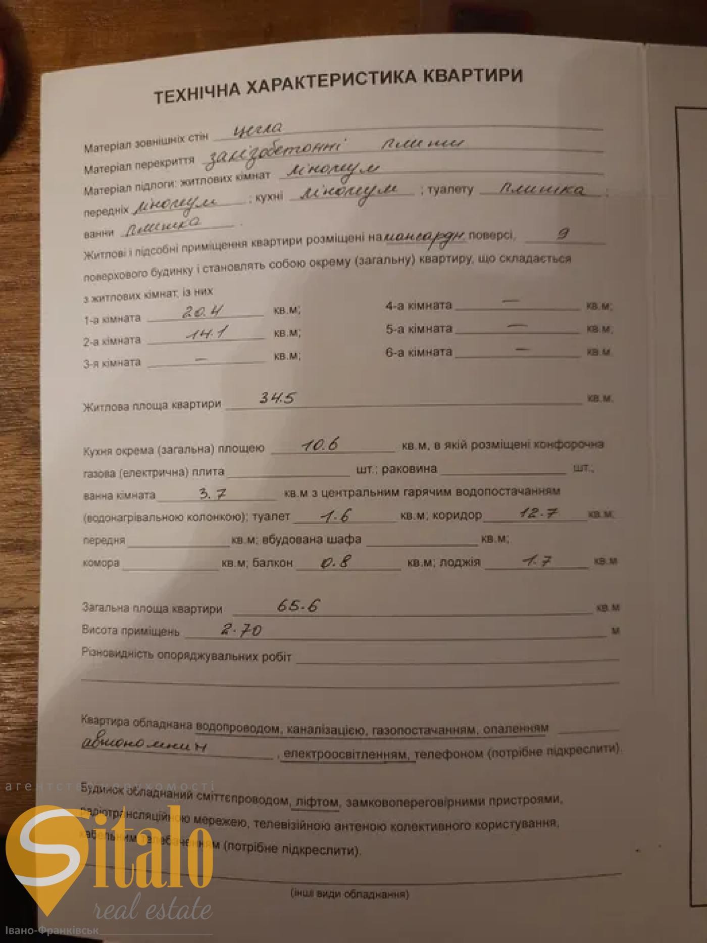 Загальна площа 65.6м2, площа кухні10.6м2, житлова площа 34,5м2