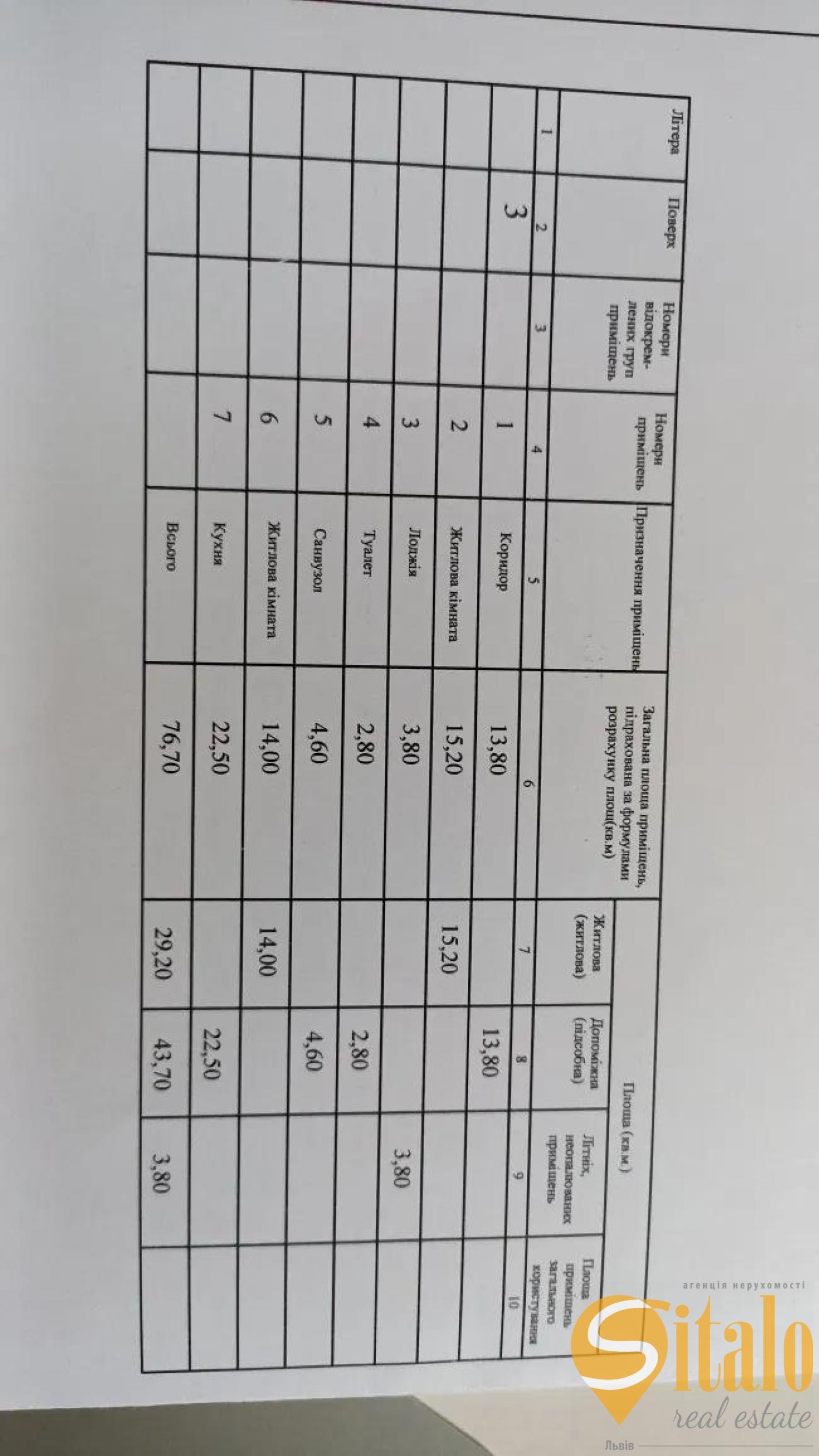 Загальна площа — 76,7 м². Житлова — 30 м². Кухня-вітальня 22 м² — ідеальний простір для сучасного планування.