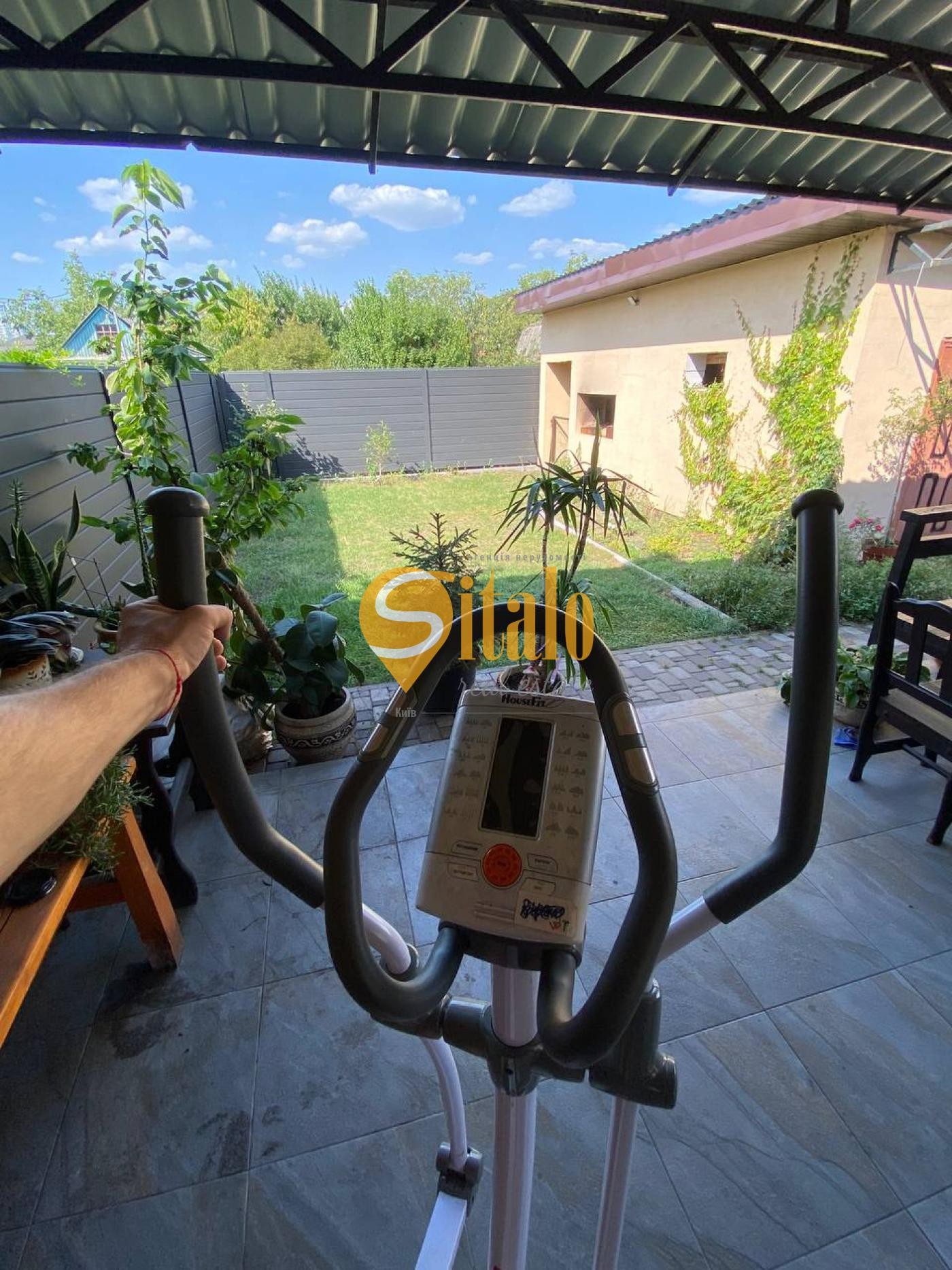 - велика крита тераса обладнана меблями, тренажерами для заняття фітнесом та прикрашена рослинами у горщиках;