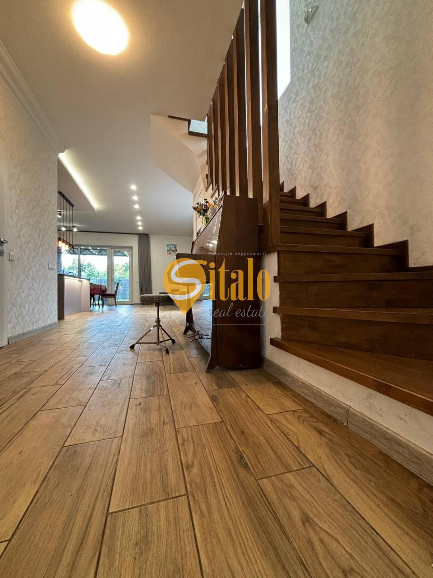 Велика вітальня (TV 80 дюймів, великий кондиціонер, диван, столи та стільці, класичне фортепіано),сучасна кухня з вбудованою побутовою технікою , 1 спальня зі своїм окремим виходом в сад та великою гардеробною, санвузол з пральною та сушильної машиною, гардероб, котельня (з бойлером на 200 л та системою теплої підлоги по всьому будинку). Сходи на другий поверх обладнані дубовими ступенями та великим вікном, що надає неймовірного затишку.