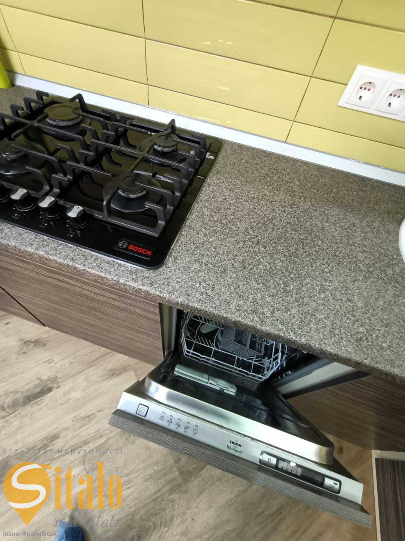 На підлозі в кухні, коридорі, санвузлі - плитка, в кімнатах - ламінат.