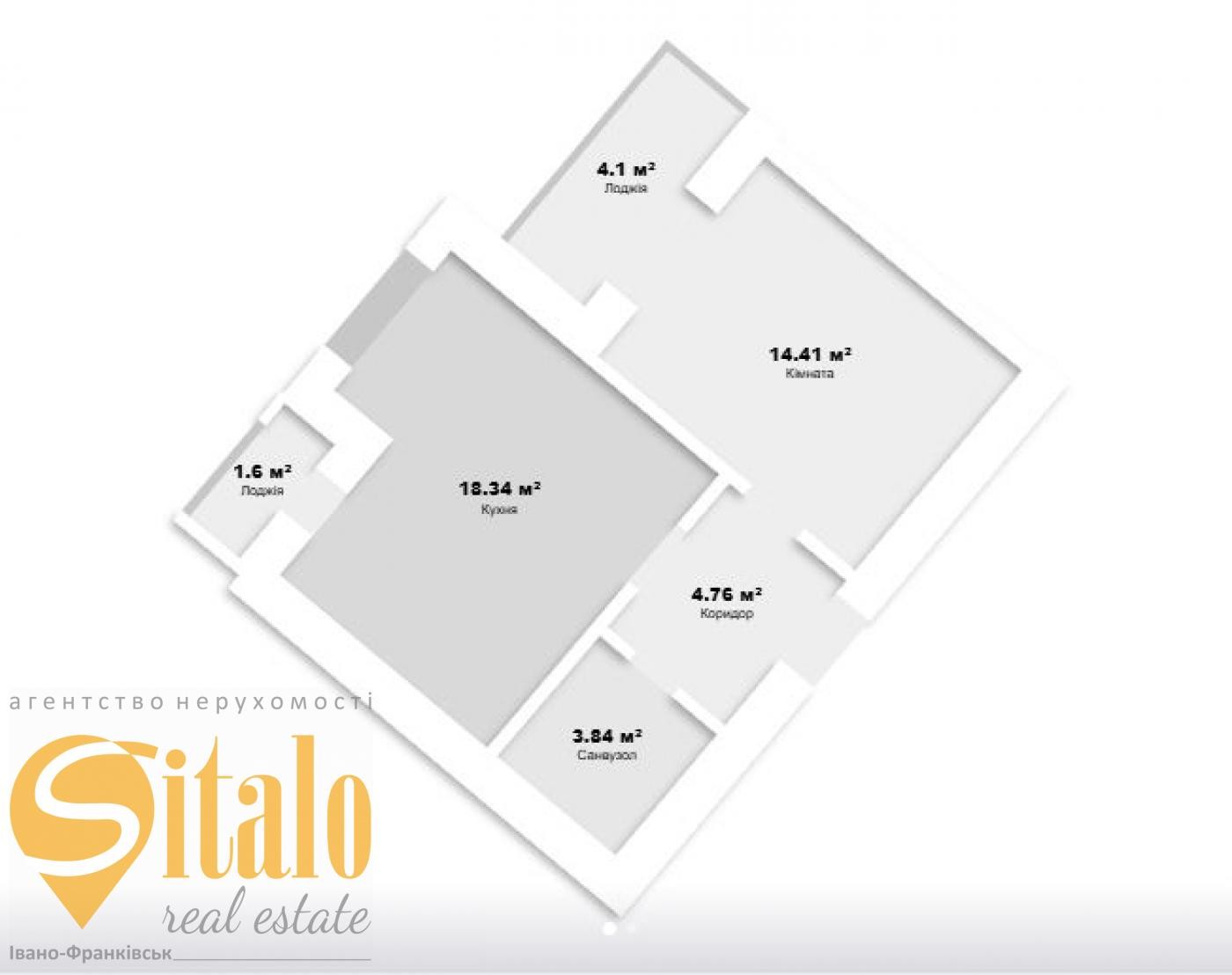 Загальна площа 47.6 кв. м., кухня 18.34 кв.м.