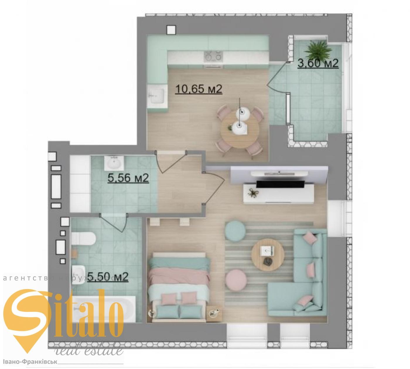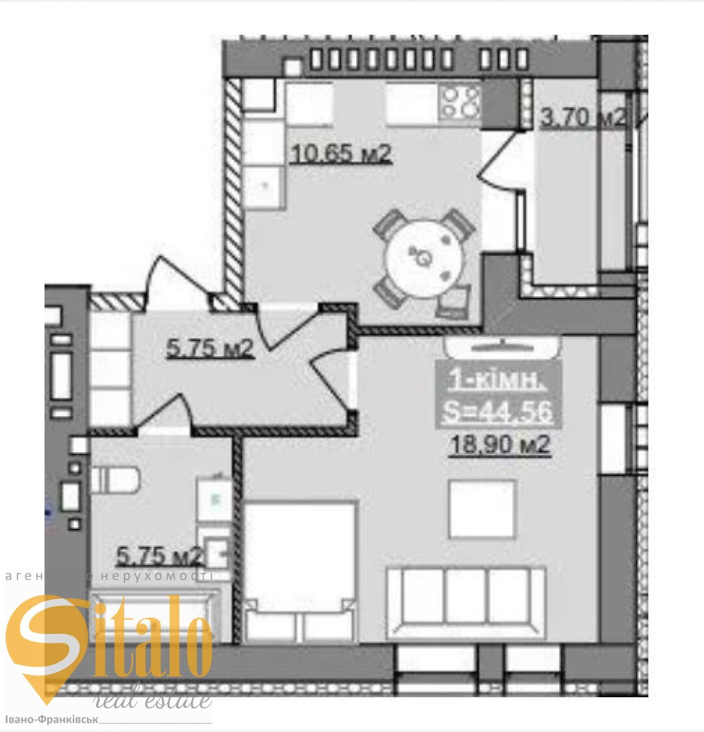 Загальна площа 44,56кв. м., кухня 10,65 кв. м..