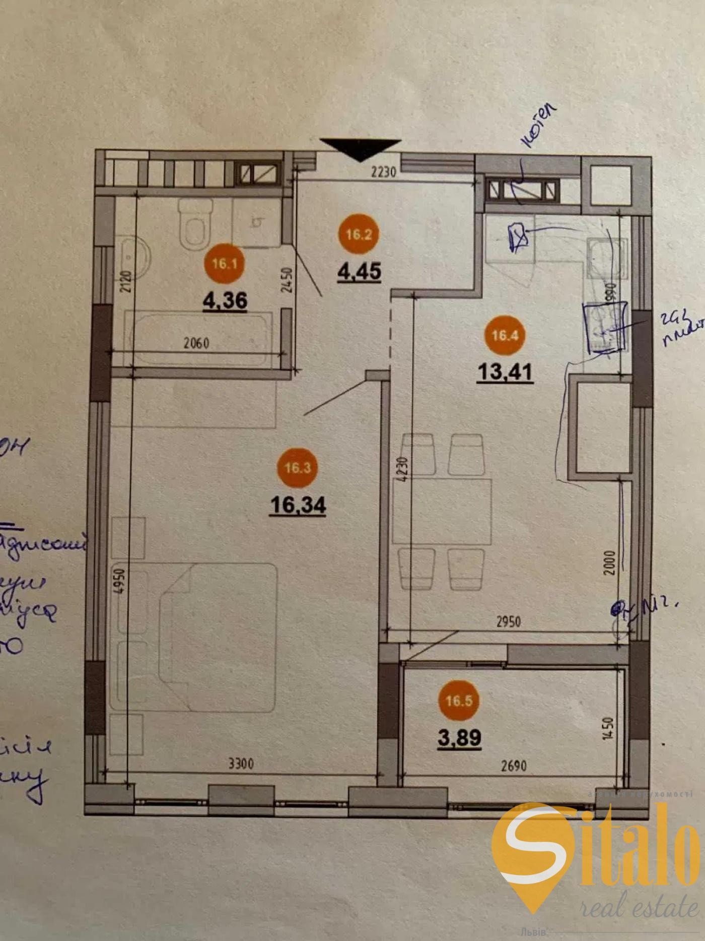 Поверх 4/9. Загальна площа квартири 42 кв.м., житлова площа 16,3 кв.м., кухня 13,4 кв.м., також в квартирі є засклена лоджія із кухні 3,8 кв.м. Вигляд із вікон у внутрішній двір.