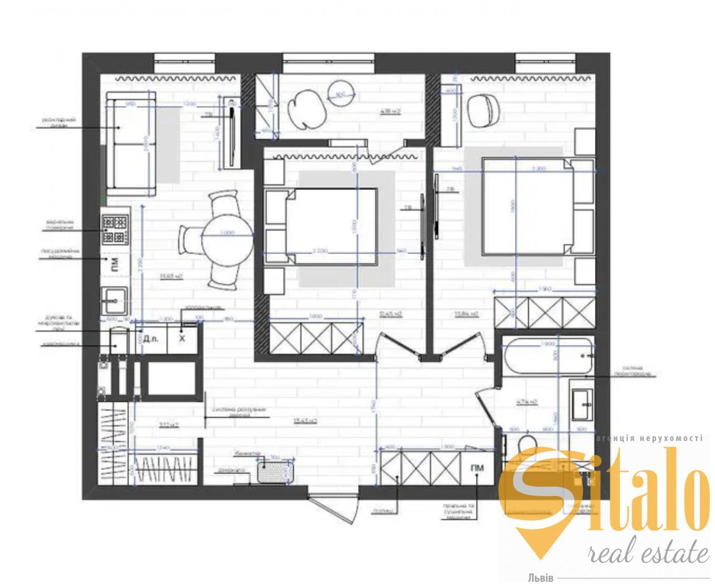 2 ізольовані кімнати, кухня вітальня, гардеробна,лоджія.