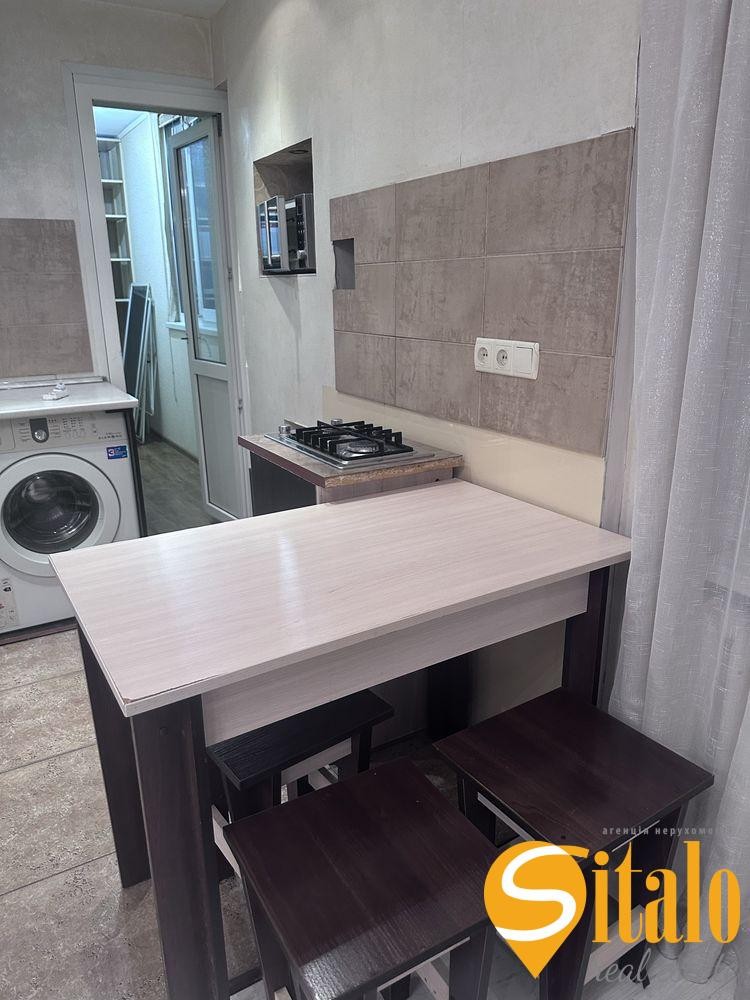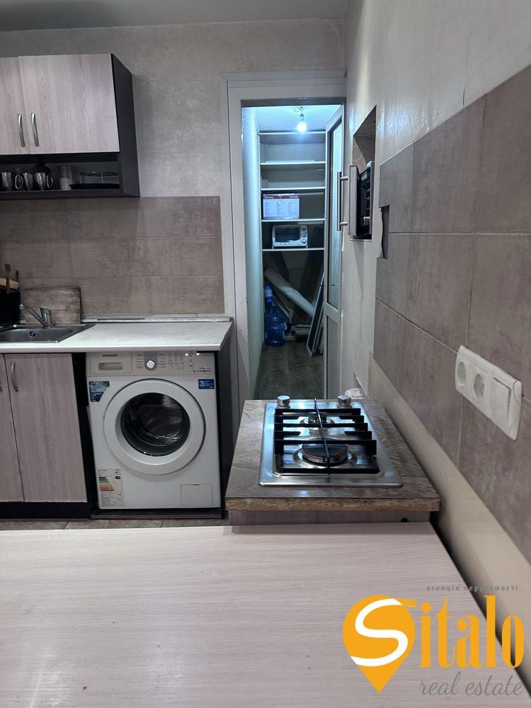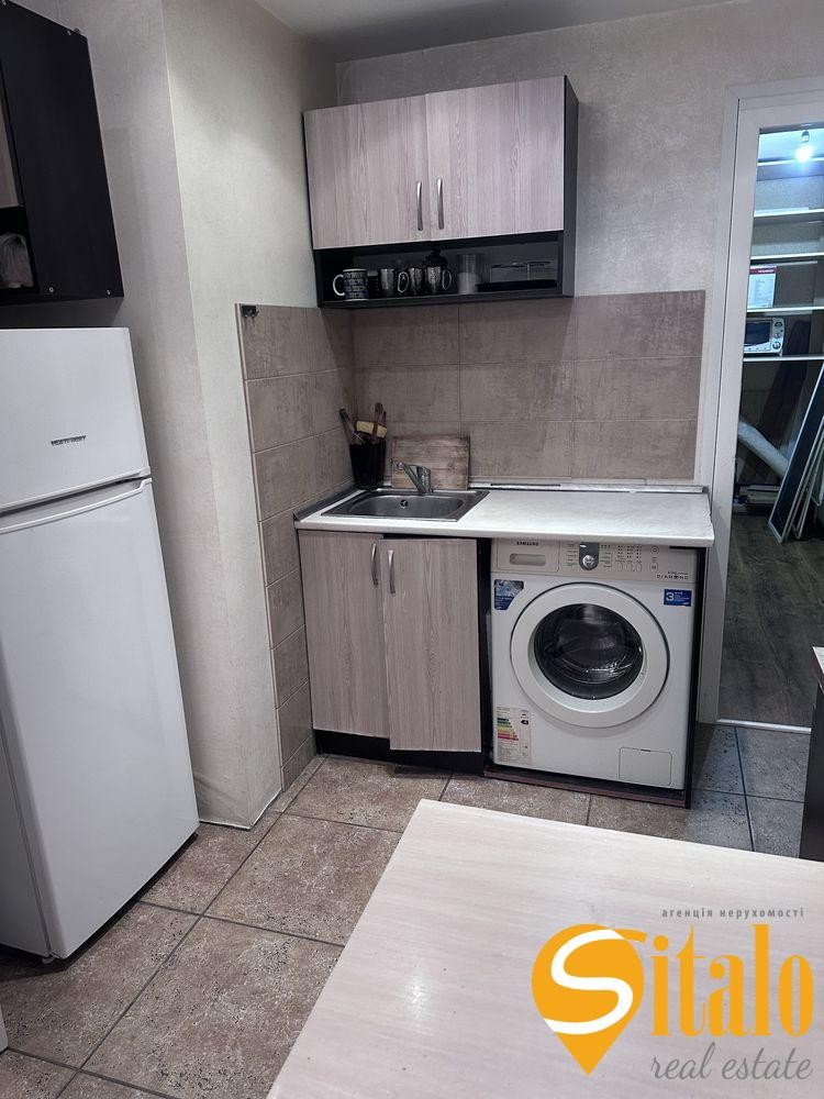 Кімната разом з невеличкою кухнею укомплектована всіма необхідними меблями та технікою для повноцінного життя.