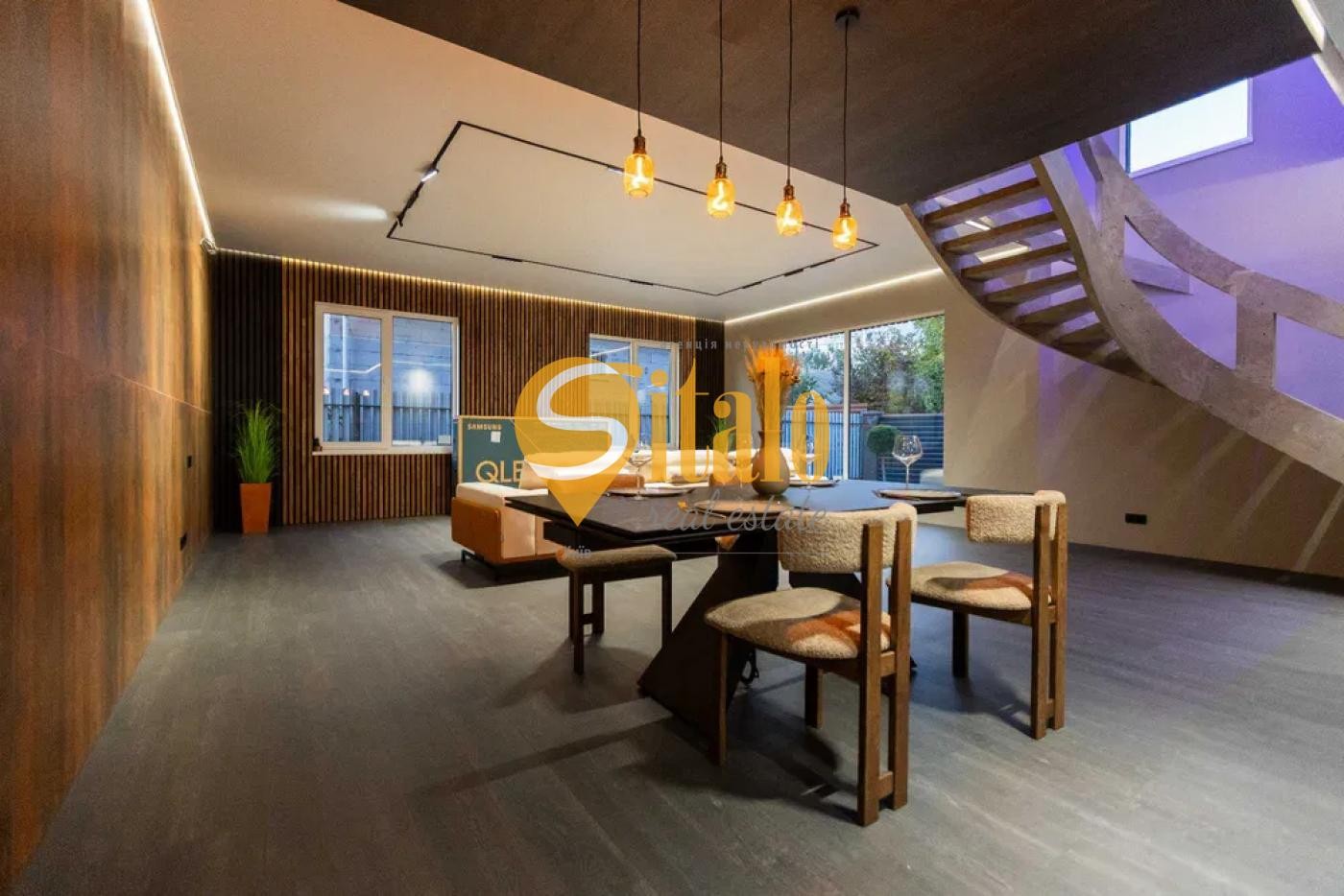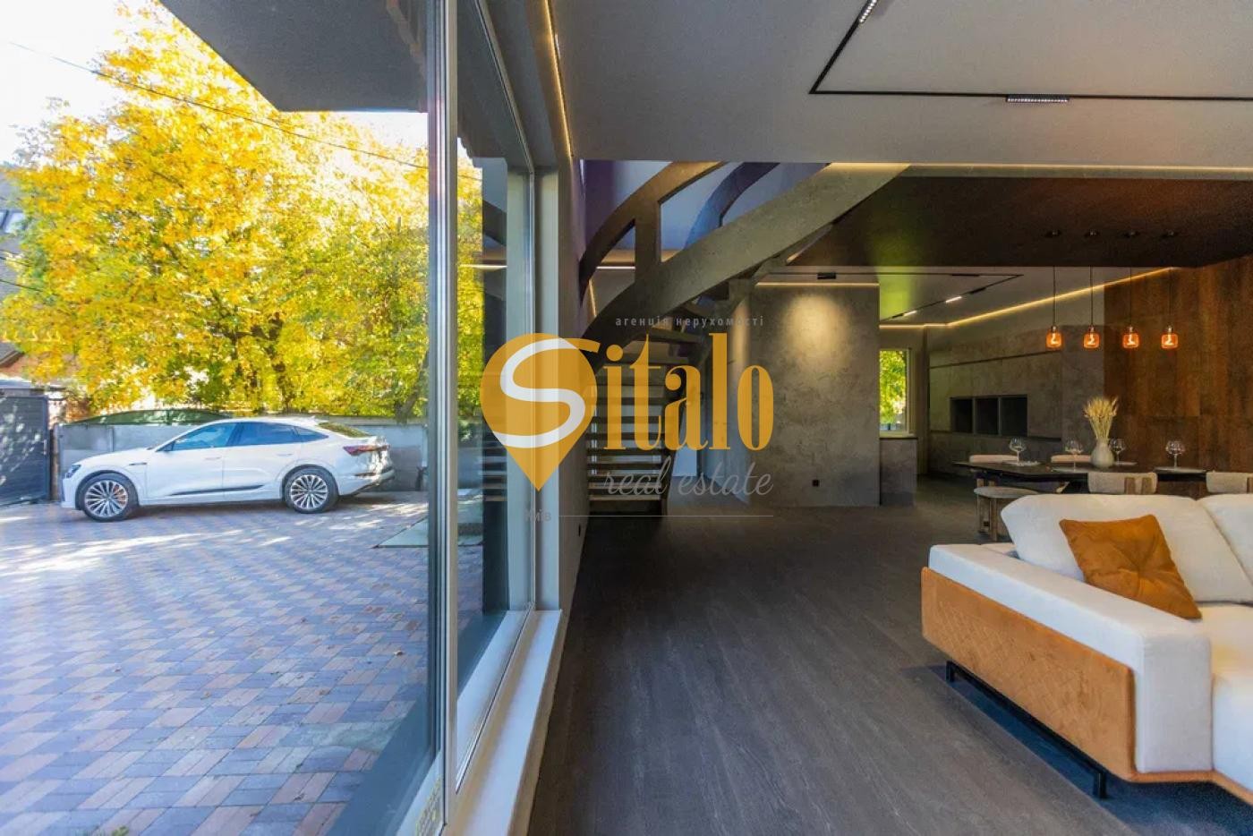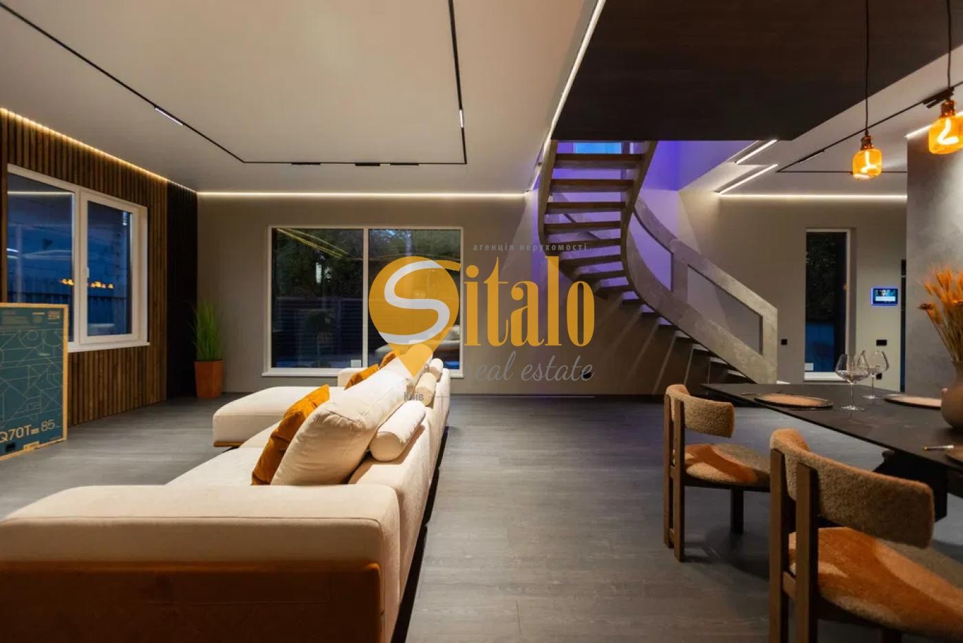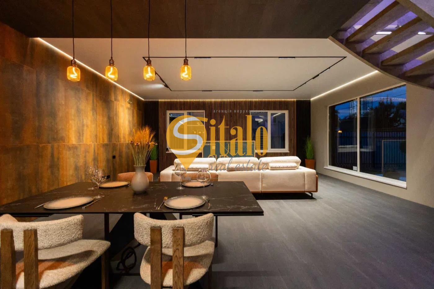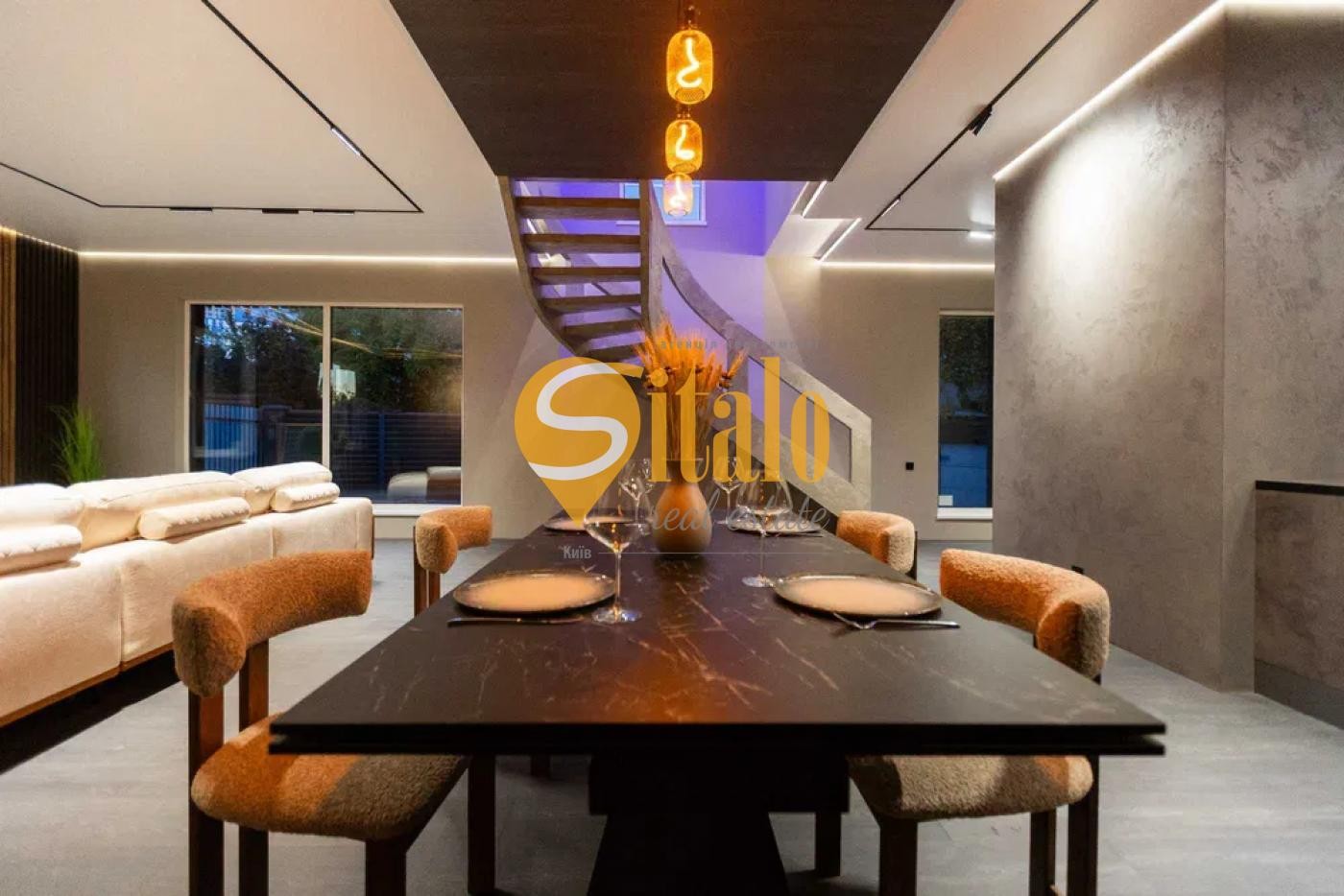 Ексклюзивні сходи, великий і зручний диван BLANCHE, обідній стіл Італія — подвійна кераміка.
