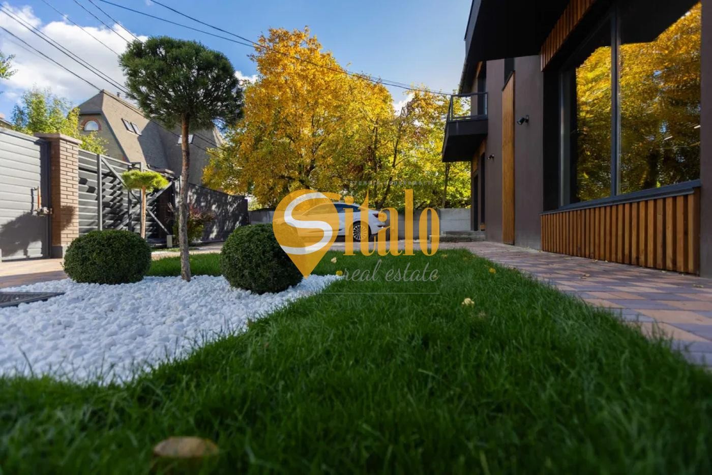 Рулонний газон преміум-класу (мятлик) з автополивом і оздобленням білосніжним каменем з Греції.
