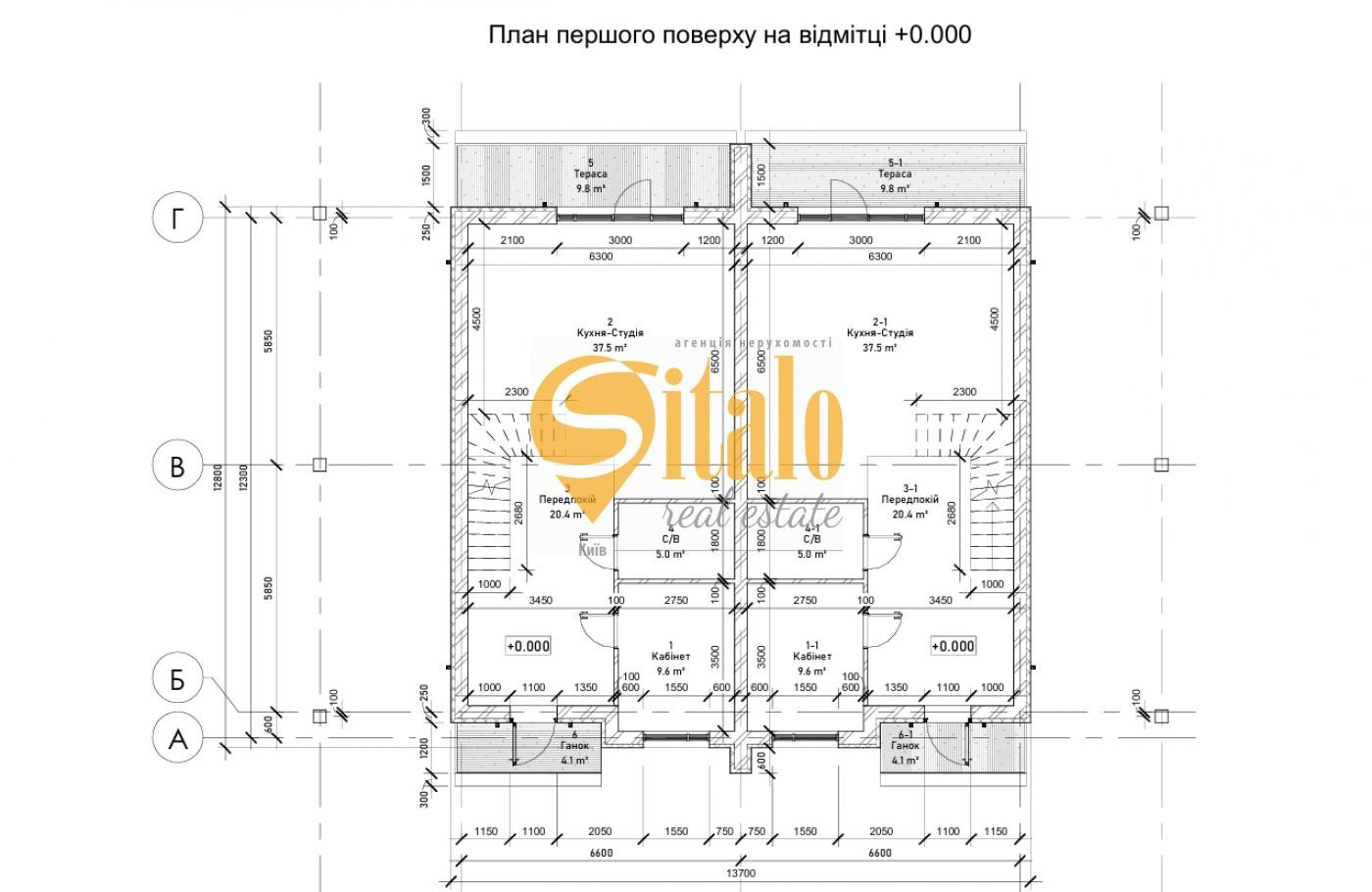 Перший поверх: кухня-вітальня, кабінет, санвузол, передпокій.