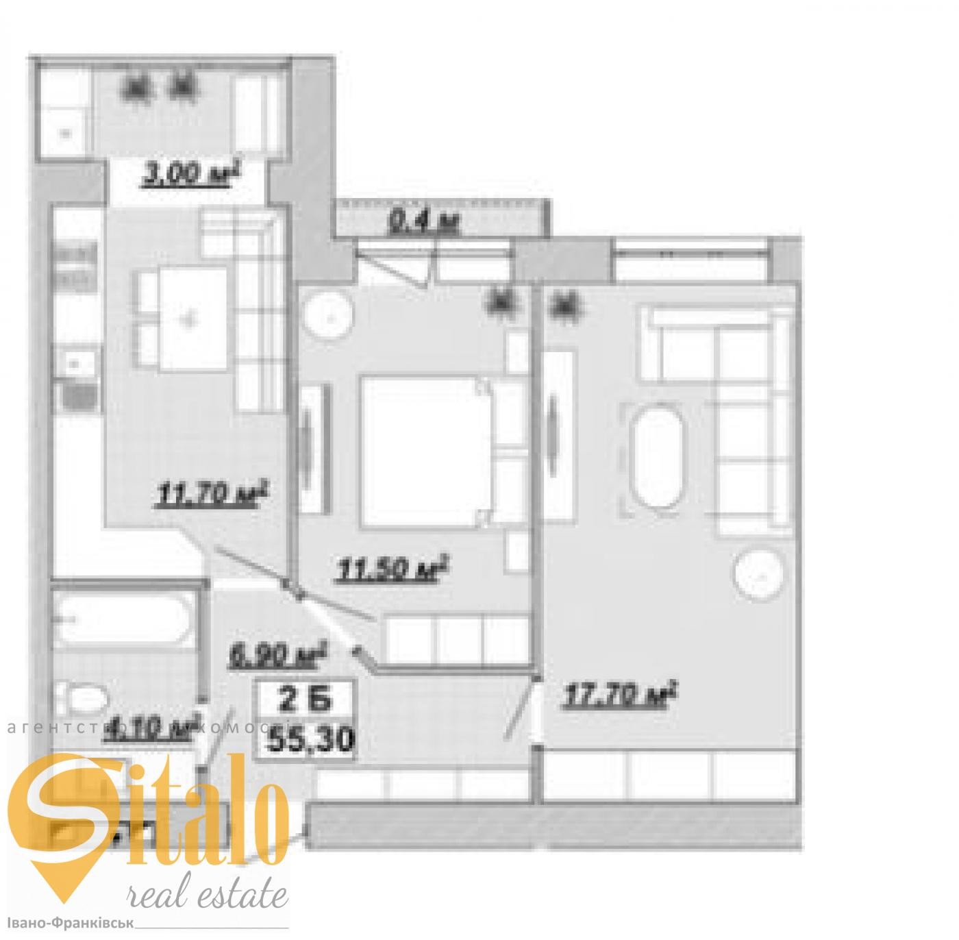 Загальна площа квартири 55,3 кв.м, кухня 11,7 кв.м.